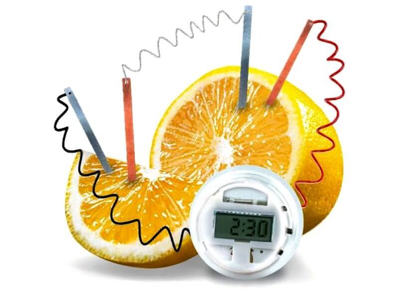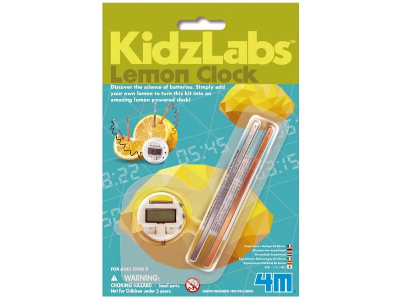 Savanyúan nézed az időt? Egy citromból órát készíteni? Érdekes elgondolás. És mindezt meg is tudod valósítani a 4M citrom óra készlettel! Nem kell semmi mást tenned, minthogy szerzel egy citromot, és félbevágod. Mindkét felébe nyomj bele egy ezüstszínű cink és egy vörös színű réz elektródát, majd kösd össze a vezetékeket a leírásnak megfelelő módon. A vezetékeket ragasztószalaggal tudod az elektródákhoz rögzíteni, és mivel a fém rudak reakcióba lépnek a citrommal, áram termelődik. Az áram elég ahhoz, hogy az óra mutatni tudja az időt. A 4M citrom óra készlet nem csak citrommal, de más savas gyümölccsel, almával, naranccsal, sőt még krumplival is működik!