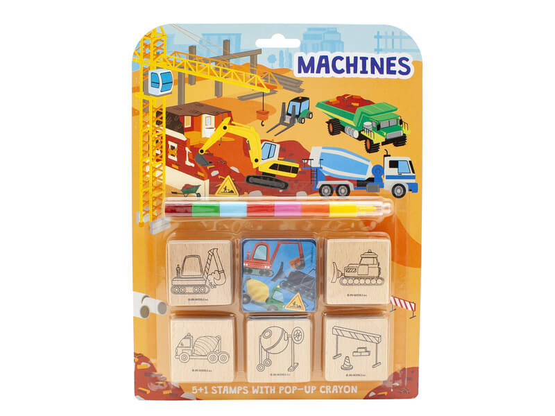 Nagyszerű szórakozás a bélyegekkel-munkagépek motívumokkal! A bélyegzős tevékenységnek köszönhetően a gyerekek nemcsak képzelőerejüket és kreativitásukat, hanem finommotorikáját is fejlesztik. A csomag 5db könnyen megfogható fanyomdát és egy színes nyomdapárnát tartalmaz kedvenc motívummal. A nyomda mérete: 4,5×4,5 cm.