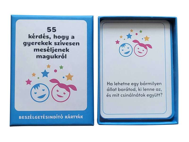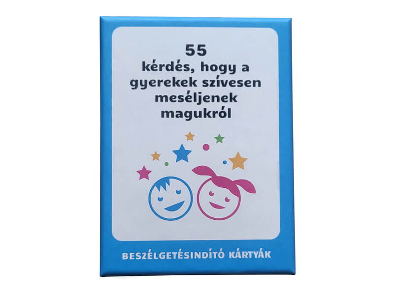Egy interaktív és gondolatébresztő társasjáték, amely célja, hogy segítse a felnőtteket és a gyerekeket a nyitott és élvezetes kommunikációban. A játék 55 kártyát tartalmaz, mindegyik egy-egy érdekes és gyermekbarát kérdéssel, amelyek arra ösztönzik a gyerekeket, hogy megosszák gondolataikat, érzéseiket és élményeiket. A kérdések úgy lettek megalkotva, hogy a gyerekek könnyen és örömmel válaszoljanak rájuk, miközben a felnőttek is betekintést nyerhetnek a gyerekek gondolkodásmódjába és világába. A játék rugalmas, nincs meghatározott játékidő, így alkalmazkodik a játékosok igényeihez és a beszélgetés menetéhez. A kártyák minőségi anyagból készültek, színes ami még inkább felkelti a gyerekek érdeklődését. Ez a társasjáték tökéletes eszköz lehet a családi összejöveteleken, baráti találkozókon vagy akár az iskolai környezetben is, hogy elősegítse a gyerekek közötti és a gyerekek és felnőttek közötti kommunikációt.