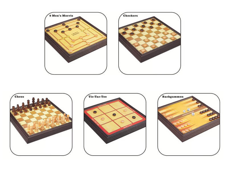 Játsszatok szórakoztató társasjátékokat ezzel az 5 az 1-ben társasjáték készlettel! Az 5 az 1-ben sakk és társasjáték készlet egy cserélhető lapokkal készült játéktáblát tartalmaz, kisebb figurákkal, dobókockákkal. A társasjáték készlettel dámajátékot, backgammont-t, vagy mal-mot is játszhattok, a csomagban 5 különböző játékfelületet találsz.