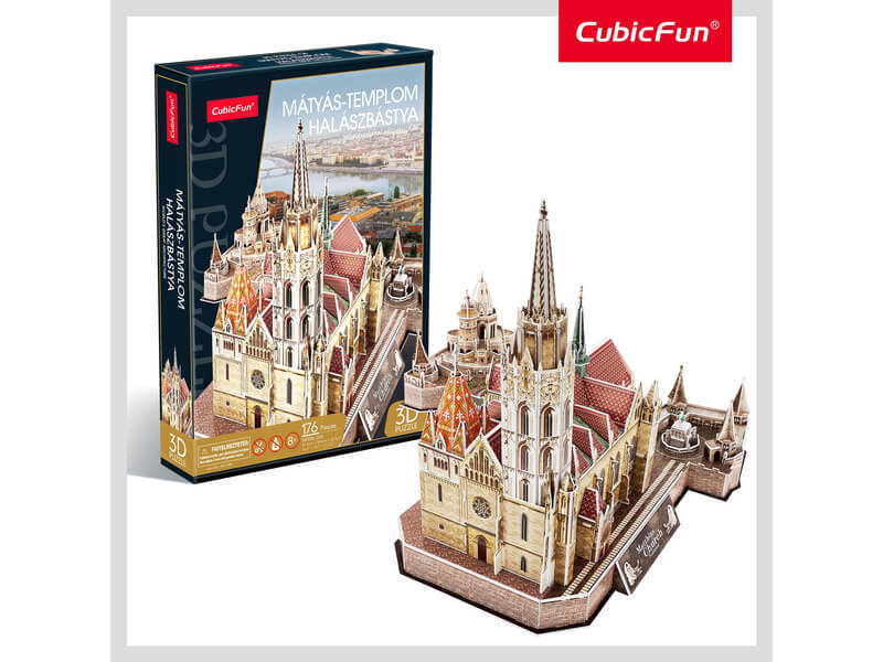 A Mátyás-templom és a Halászbástya épülete, 3D puzzle változatban! A Mátyás-templom és a Halászbástya a Budai Vár kerületének ékessége. Mindkét épület Schulek Frigyes tervei alapján készült, aki az építkezéseket is irányította. A Mátyás-templom a Budavári Koronázó Főtemplom nevet is viseli, nagy történelmi múltra tekint vissza. A Halászbástya 140 méter hosszú, Budapest egyik legismertebb műemléke. A Mátyás-templom és a Halszábástya 176 darabos 3d puzzle kirakott méretei: 41 x 38 x 33 cm.