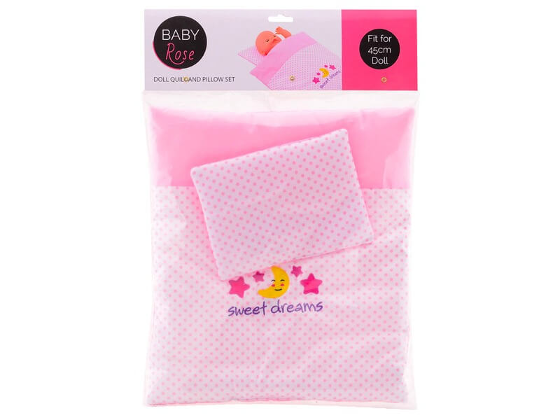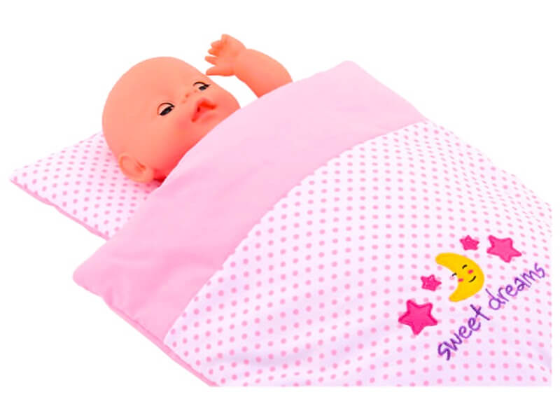 Segíts a játékbabának pihenni, párnával és takaróval! A Baba párna és paplan készletben egy Sweet Dreams feliratú, pöttyös mintájú pici párnát és egy vastag paplant találsz, amik segítenek kedvenc játékbabádnak elaludni. A paplan és a párna puha textilből készült, a játék bármelyik 45 cm-es, vagy kisebb játékbabával együtt használható. A paplan méretei: 32 x 36 cm, párna méretei: 19 x 14 cm.