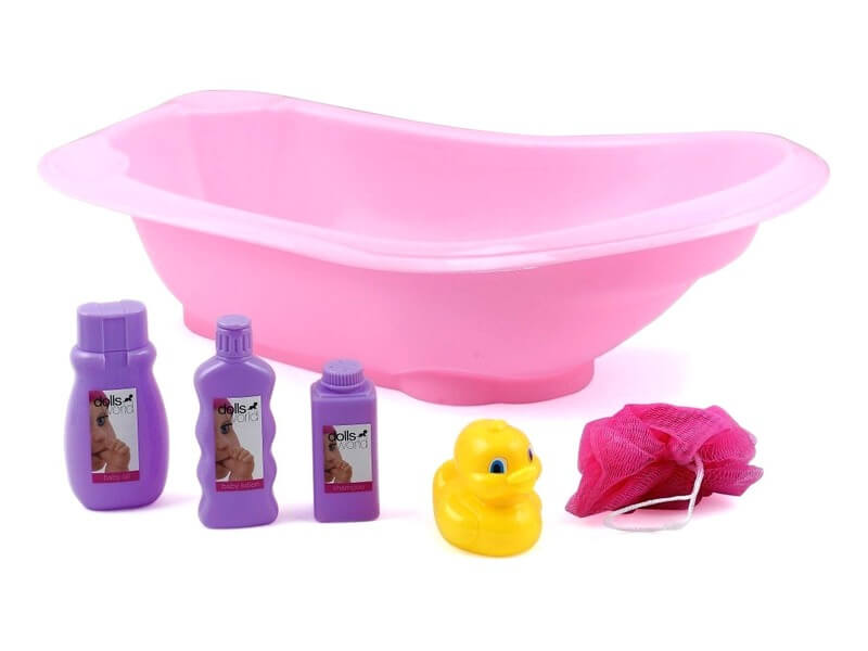 Fürdesd meg a játékbabád, kend be illatos krémekkel! A Dolls World Babakád kiegészítőkkel egy nagyobb méretű rózsaszín babakád, amiben tisztára tudod csutakolni a játékbabáid! A kádban samponos, krémes és babaolajos flakont is találsz, fürdés közben a baba egy sárga kacsával is tud játszani. A kádat fel lehet tölteni vízzel, és egyszerűen csak öntsd ki a vizet, ha már elég volt a babának a habfürdőből. A Babakád kiegészítőkkel együtt használható minden 41 cm-es játékbabával! Méretek: 43 x 24 x 14 cm.
