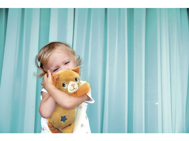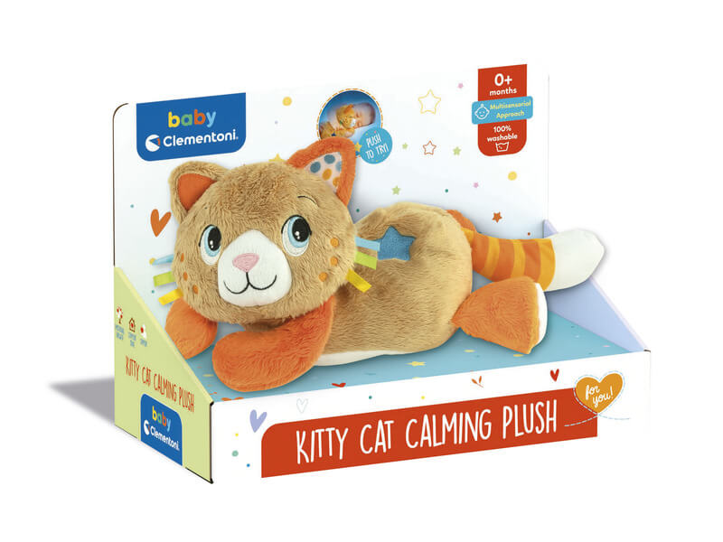 Puha plüss cica, ideális a gyerekek megnyugtatására és az elalvásra való felkészítésére. A játék speciális rezgéssel rendelkezik, amely a macska dorombolását utánozza, és édes dallamokkal párosítva megnyugtatja a gyermeket és segít neki elaludni. A macska a fehér zajt is reprodukálja, amely megnyugtatja a gyermeket az elalvás előtti relaxáció során. A plüssjáték az elektronikus modul eltávolítása után mosógépben mosható. A termék Olaszországban készült, és a Ron Ron terápia ihlette.