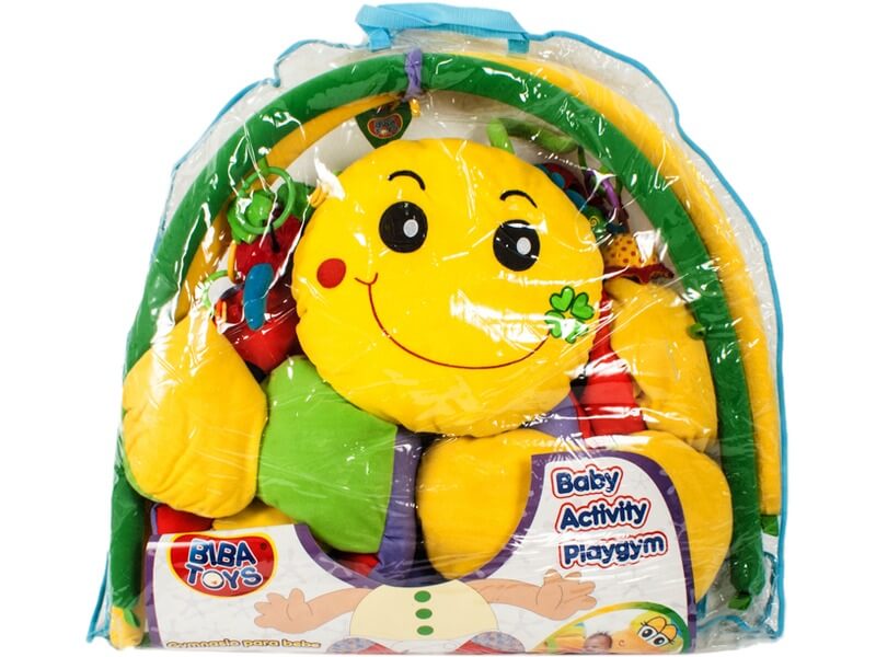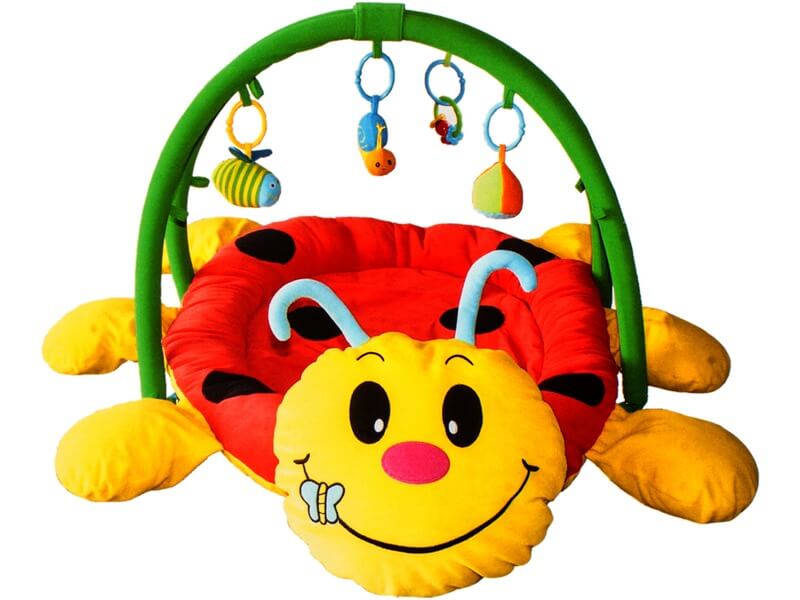 Bébi játszószőnyeg, katicás A katica alakú játszószőnyeg bájos mintákkal . Kinyitott állapotban mérete: 89 x 64 cm. Két alul rögzíthető karon (magassága: kb. 60 cm) 4 db levehető játék van felfüggesztve. A felfüggeszthető játékok és a játszószőnyeg színei, mintái fejlesztik a baba látását, hallását, tapintását, a későbbiekben pedig szem-kéz koordinációját és kognitív képességeit. Úszülöttkortól használható. Átlátszó műanyag tárolózsákban szállítjuk, ezáltal könnyen, kis helyen tárolható és utazások alkalmával is praktikus.