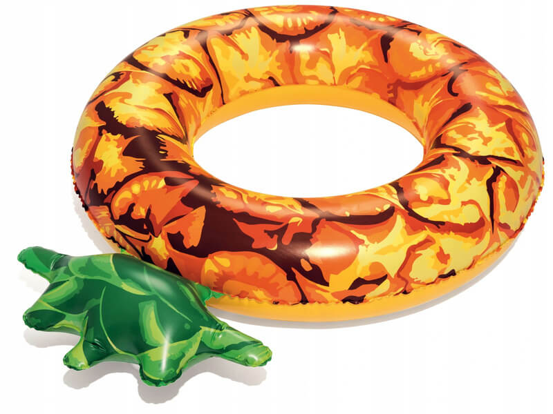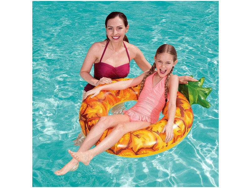 Lebegj a vízben egy ananász mintájú úszógumival! Az ananász úszógumi egy vicces úszókarika, ami egy ananászt mintáz. Az úszógumi segít fent maradni a víz tetején, a karika biztonsági szelepen keresztül könnyedén felfújható. Az Ananász úszógumi mérete: 116 x 88 cm.