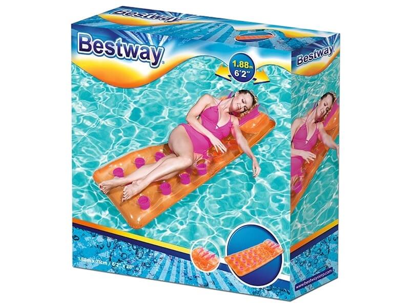 Többféle színű, felfújható poharas matrac a forró nyári napokra! Az átlátszó matracágy igazi kényelmes pihenést biztosít akár a medence közepén is. A matracot biztonsági szelepen keresztül tudod felfújni, a matrac nagyon erős, előre tesztelt műanyagból készült. Az átlátszó matracágy szürke, sárga, zöld és fehér színben kapható. Felfújt méretek: 188 x 71 cm. A játékok külön kaphatóak.
