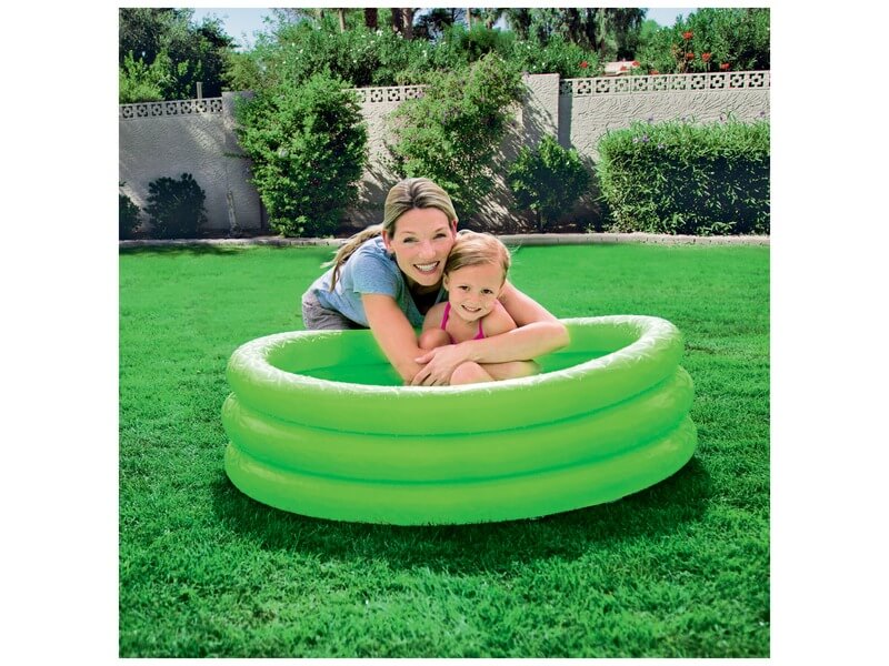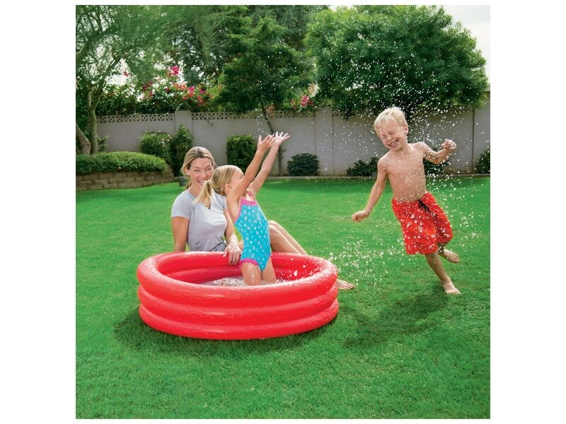 A medence nagyon erős műanyagból készült, egyszerre több gyerek is kényelmesen tud benne lubickolni. A felfújható háromgyűrűs gyerek medence biztonsági szeleppel van felszerelve, ha kiesik a dugója, akkor sem fog azonnal leereszteni. Felfújt méretek: 122 x 20 cm.