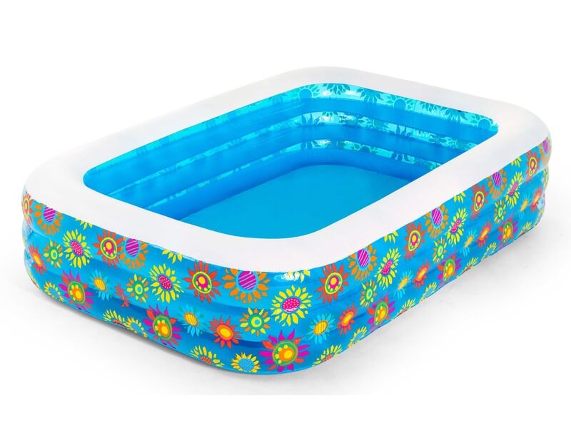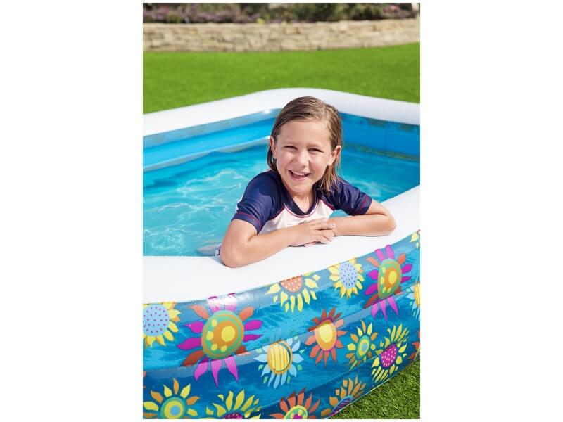 Pancsoljon a család a szögletes medencében! A nagy Szögletes medence akár két felnőttnek és gyereknek is jó a hűsöléshez a legnagyobb forróságban. A nagy medence több kamrás, biztonsági szeleppel van felszerelve, könnyen felfújható és leereszthető. A medence erős PVC-ből készült, nagyon tartós, ellenáll az időjárásnak. A készlet egy erős, öntapadó javítófoltot is tartalmaz. Felfújt méretek: 229 x 152 x 56 cm.