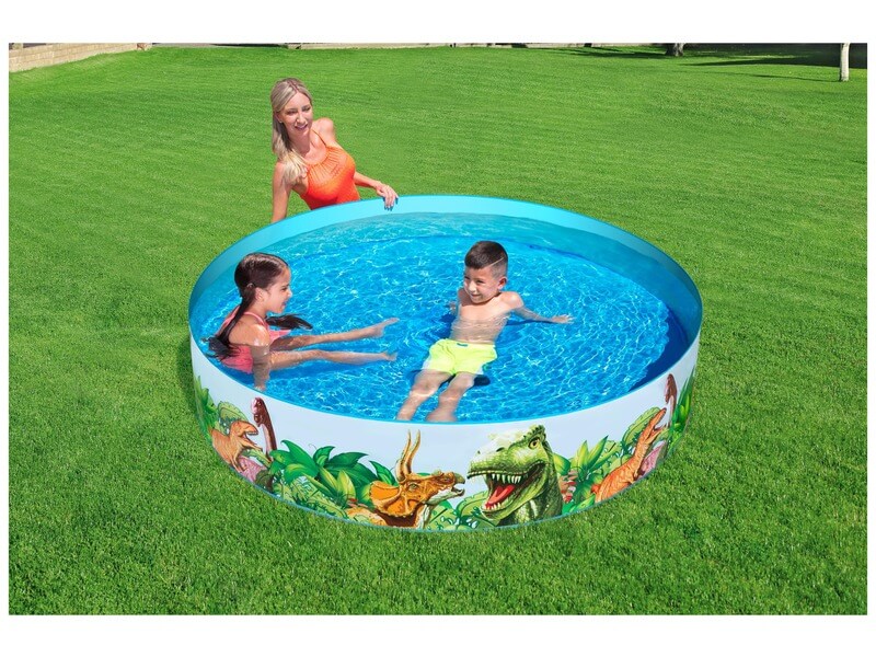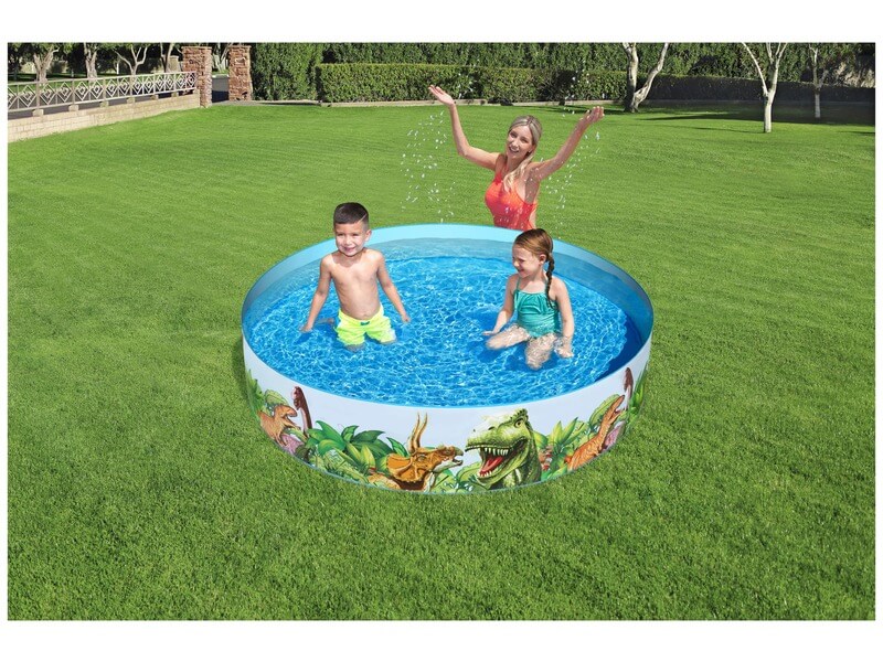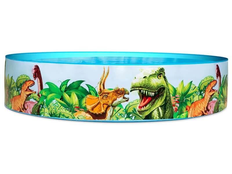 Hűsítsd magad dínók mellett a medencében! A dinoszaurusz medence egy széthajtogatható, merev falú medence, amiben akár egyszerre két-három gyerek is kényelmesen tud pancsolni. A medence dínókkal van díszítve, a merev falú medencét kerti tömlőről lehet kényelmesen feltölteni vízzel. Méretek: 183 x 38 cm.