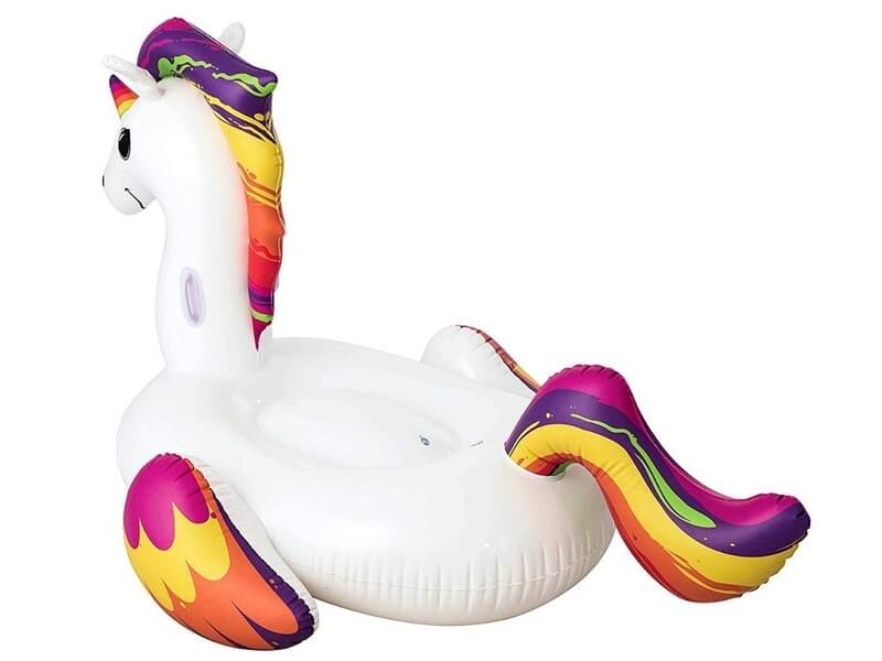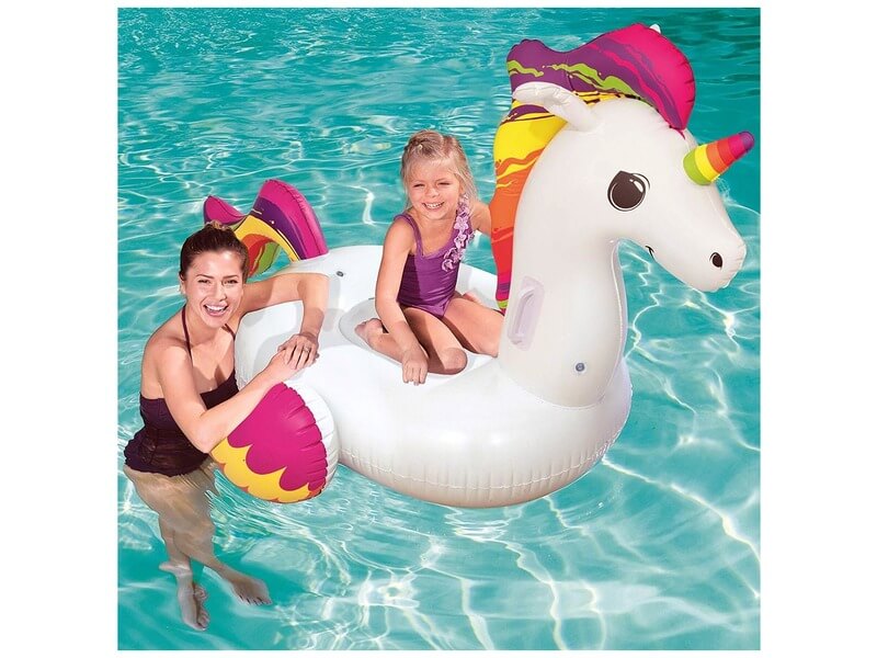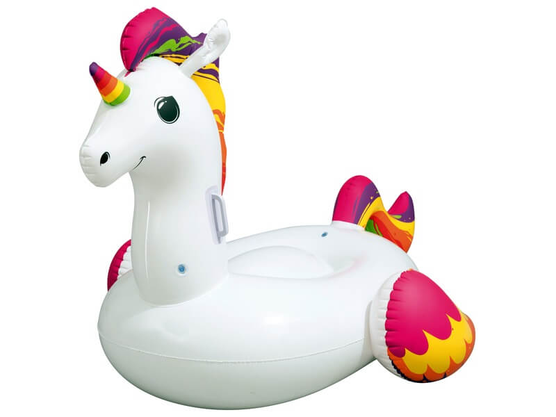Ülj fel az egyszarvú hátára a medence közepén! Az Unikornis felfújható lovagló egy nagyobb méretű, szivárvány színű sörénnyel dekorált PVC lovagló matrac, amit a medencében tudsz használni. Az unikornis nyakában ülve tudsz megülni rajta, az egyszarvút biztonsági szelepeken keresztül lehet felfújni. Az Unikornis felfújható lovagló készlet egy öntapadós javító foltot is tartalmaz. Felfújt méretek: 150 x 117 cm.