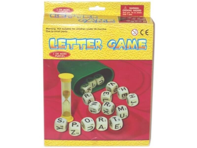 Egyszerű szabályokkal rendelkező szókirakó játék betűkockákkal, homok-órával és dobó pohárral.