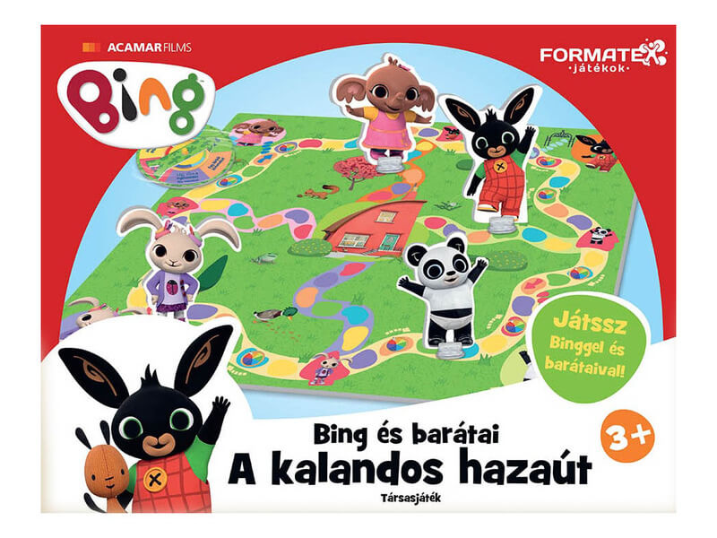 A Bing és barátai: A kalandos hazaút egy izgalmas, ugyanakkor egyszerű szabályrendszerrel rendelkező társasjáték a legkisebbeknek, ahol kedvenc mesehőseikkel kerekedhetnek fel egy kalandos útra. A játékban Bing nyuszi egy napsütötte napon piknikre hívja barátait a parkba. A közösen eltöltött vidám órák után a csipetcsapat azon kapja magát, hogy már esteledik, így ideje hazatérni, hogy a vacsora és a fürdés után álomra hajtsák a fejüket. Mindannyian útnak indulnak, de vajon ki fog először hazaérni? A pörgettyű megmutatja, hogy ki milyen színű mezőre és hányat léphet. A játék győztese az, aki bábujával először hazaér. A társasjáték fejleszti a gyerekek színfelismerését, koncentrációs készségét, kommunikációját, valamint segít a számfogalom kialakításában és a számok tanulásában is. Csomagolási méret: 5 x 27 x 23 cm