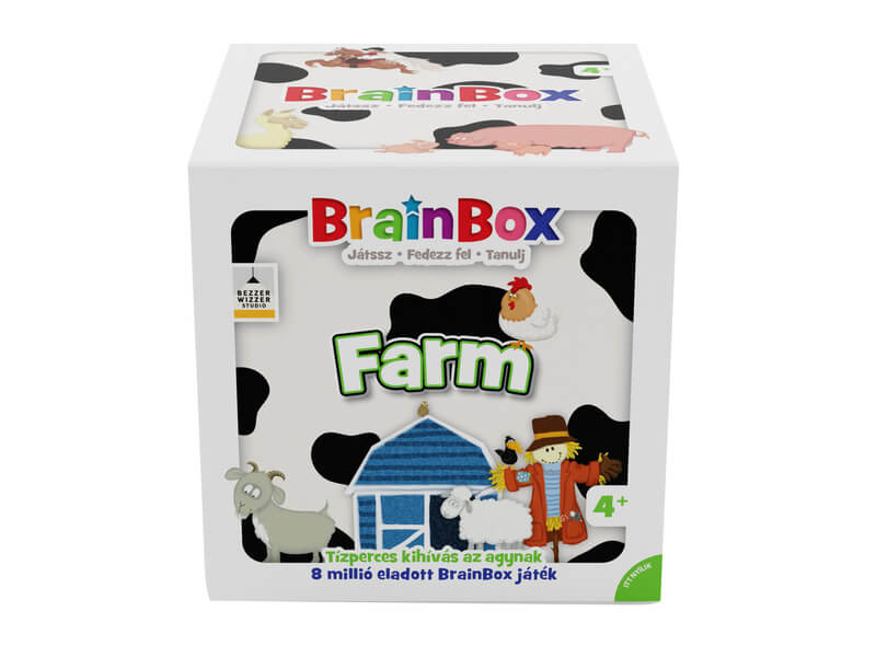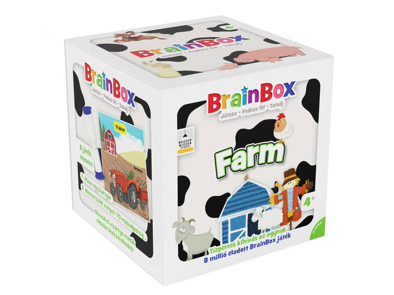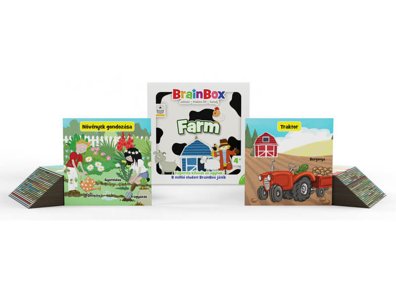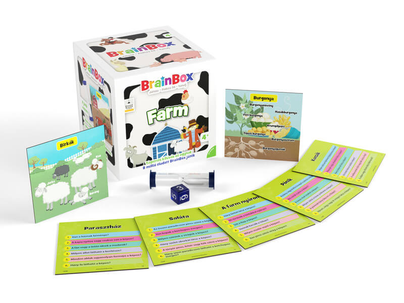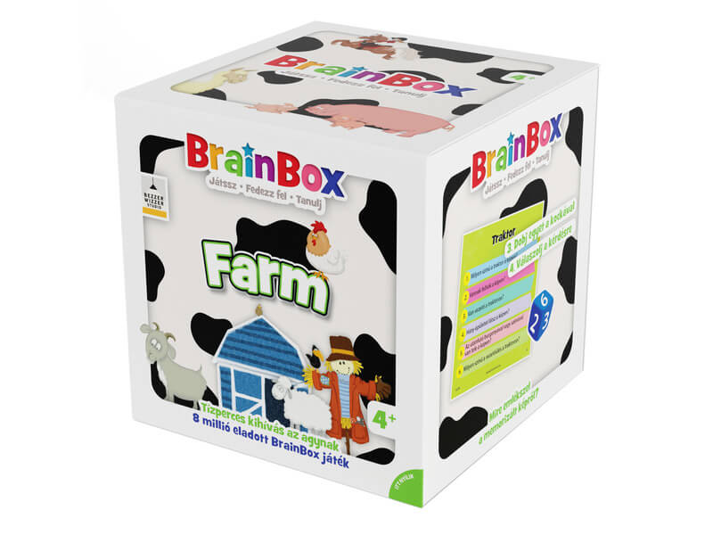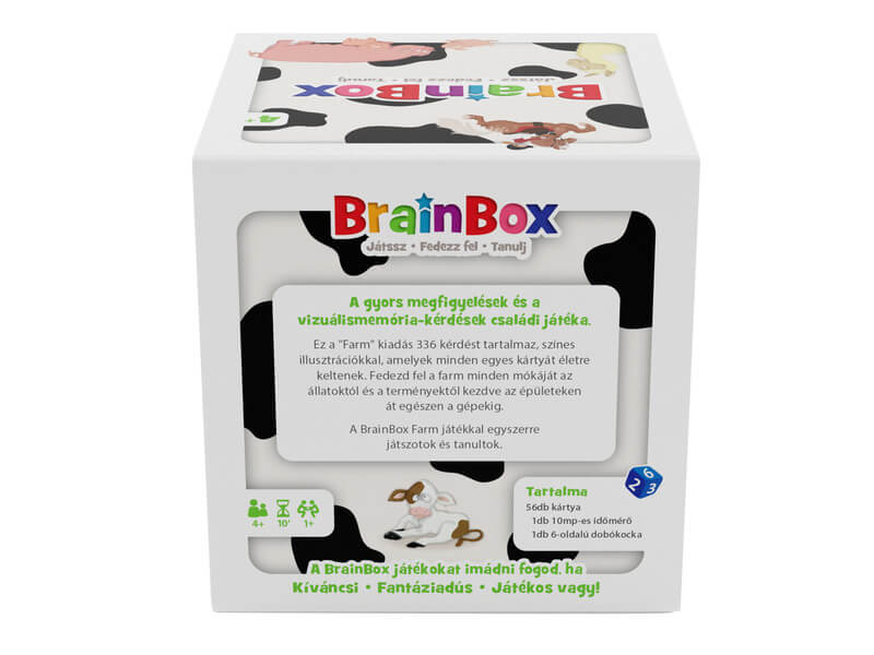 Remek agytorna és szórakozás, egy vagy akár több játékos részére! A BrainBox Farm lényege, hogy 10 másodperc alatt minél több mindent meg kell figyelni a kihúzott kártyán szereplő tárgyról, állatról. Ezután dobókockával kell dobni, és a kockán szereplő sorszám szerinti kérdésre kell helyesen válaszolni. A homokóra méri az időt, a kártyán ellenőrizhető a válasz. A doboz tartalma: 56 db kártya, 1 db homokóra, 1 db dobókocka, 1 db szabálykártya.