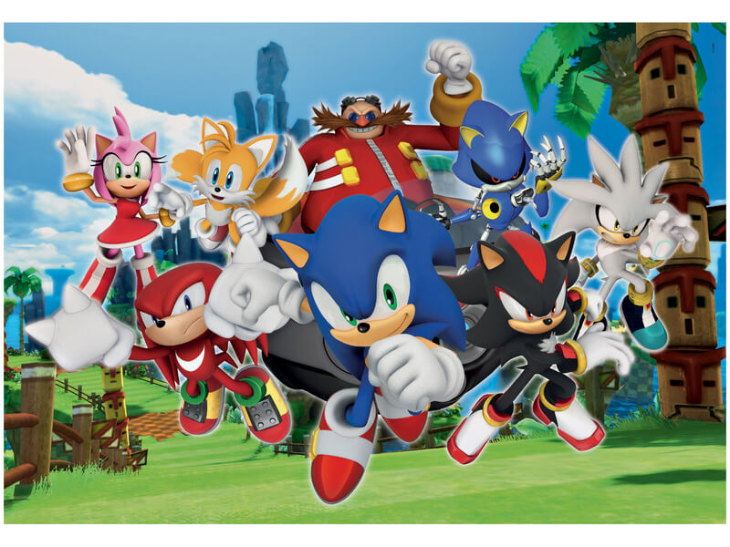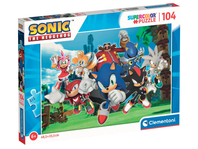 Sonic témájú Clementoni puzzle 104 darabból. Az elkészült kirakós mérete: 48,5 x 33,5 cm.