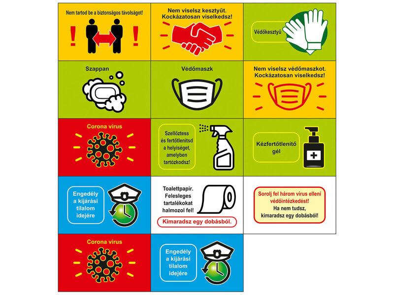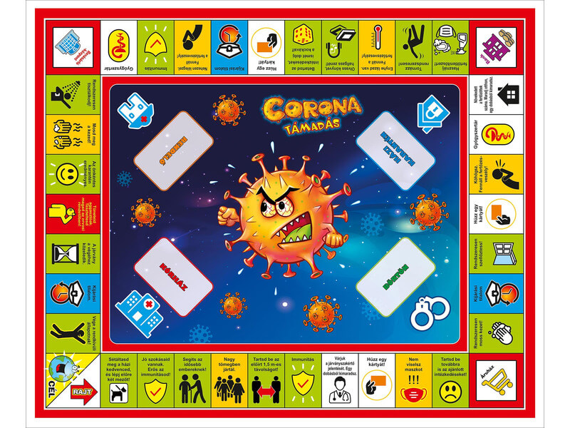 Viselkedj felelősségteljesen a járvány idején is! A Corona támadás, egy könnyen megtanulható oktató társasjáték 4 fő számára. A játék lényege, hogy a táblán végighaladva tejesítsd a világjárványt féken tartó intézkedéseket. Dobj a kockával és tudd meg, mi lesz a következő feladatod! A kézfertőtlenítéstől a tesztelésen át, akár a karanténba vonulás is megtörténhet Veled a játék során. Légy tudatos állampolgár és tartsd be a szabályokat! A mezőn ötféle szín található: sárga, piros, zöld, fehér és kék, ezek alapján húzhatsz a kártyák közül. Ha a sárga mezőre lépsz, gyalog bábudat le kell cserélned egy csontvázra és azonnal az orvosi rendelőbe kell menned tesztelésre. A játék gyakorlatias módon tanítja meg, hogy mire kell odafigyelni a vírusos időszak alatt, miközben kellemes időt tölthetsz barátaid vagy családod társaságában. A társasjátékot az nyeri, aki elsőként ér célba. A készlet tartalmaz egy játéktáblát, 4 gyalog bábut, 4 csontváz bábut, 2 db dobókockát és egy pakli kártyát.