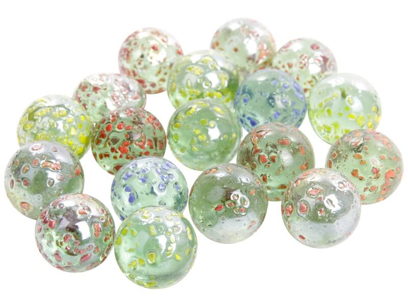 Színes csillámmal díszített üveggolyók, hálós csomagolásban! A Csillámos üveggolyó 50 darabos készlet azonos méretű, zöldes árnyalatú üveggolyókat tartalmaz, amikkel több játékot is lehet játszani a szabadban, vagy a szobában is. Az üveggolyók hálós csomagolásúak, ha benne hagyod a hálóban, és szorongatod, markolászod, akár stresszoldóként is használhatod. A Csillámos üveggolyó 50 darabos készlet üveggolyóinak átmérője: 16 mm.