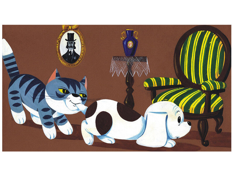 Diafilm- Rosszcsont cica „– Hrr! Mi az? Ki az? – pattant talpra Benci az ismeretlen hangra, de nem látott senkit. Benézett a karosszék alá is. – Juj! – valaki meghúzta a farkincáját. Nagyot ugrott ijedtében, egyenesen az ablakpárkányra.” Peti kutyusa, Benci békésen éli életét, amikor Kati kedvéért egy cica, Minci kerül a családba. Az unatkozó cica titokban állandóan piszkálja Bencit, aki eleinte nem is tudja, honnan jön az örökös, idegesítő nyávogás. Szerencsére éppen betoppannak a gazdik, amikor rájön az igazságra… Kockaszám: 30