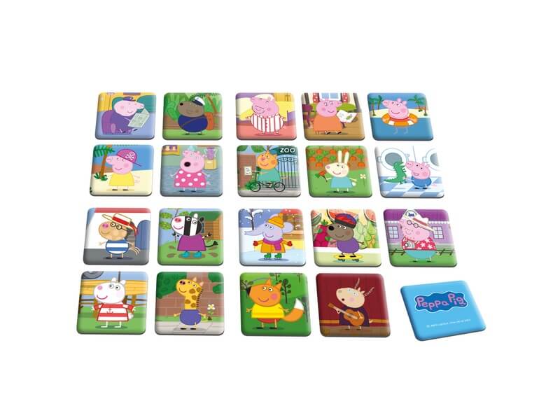 Peppás társasjáték, melyben a játékosok a klasszikus memóriajáték szabályai szerint megpróbálnak minél több egyforma pár találni a 24 közül. A memóriajátékokat nagyon szeretik a gyerekek, és nem csak azért, mert a legtöbbjük mindig megveri benne a szüleit. A tematikusan összeállított memóriajátékokban a kicsik a kedvenceik képével játszik, azok vidám karaktereit keresi. A játékot könnyíthetjük, ha kisebbekkel játszunk. Ilyenkor válasszunk 5-8 pár a 24-ből és csak azokat keverjük meg lefordítva. Amennyiben szereti a kisgyermeked a Peppa malac meséit, de még nem biztos, hogy tudnád játszani vele a memóriajátékot, akkor a 48 lapot felfordítva terítsd szét az asztalon, és csak annyi legyen a fel-adat, hogy az azonosakat keressétek meg együtt. 4 éves kortól azonban bátran keverjátek meg mind a 24 párt. A játékkal kiválóan fejleszthető a gyermekek síkbeli tájékozódása, a vizuális memória.