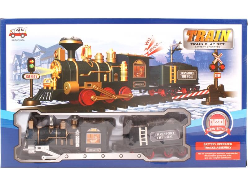 Rakd össze a síneket, induljon a nosztalgia vonat! Az Elemes nosztalgia vonatkészlet egy gőzmozdonyt és egy vonatkocsit tartalmaz, amit egy kör alakú pályán halad folyamatosan. Kapcsold össze a kocsikat, állítsd össze a pályát, díszítsd sorompóval és jelzőkkel! Ezután már csak fel kell tenned a vonatot a pályára és figyelned, ahogy száguld! A mozdony első lámpája világít, a mozdony fütyül és sistergő hangokat ad ki magából. A Elemes nosztalgia vonatkészlet 2 db AA ceruzaelemmel működik, a csomagolás az elemeket nem tartalmazza. Mozdony méretei: 15 x 5 x 8 cm. Csomagolás méretei: 40 x 6 x 24 cm.