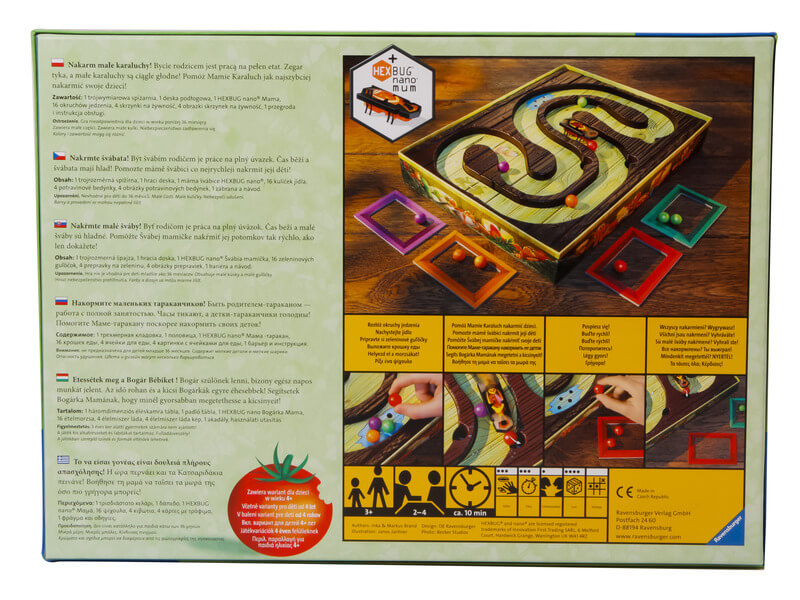 Segíts csótány mamának megetetni kicsinyeit! Az Első Csótánykám társasjáték a Ravensburgertől izgalmas elfogalaltság minden fiatal számára. Csótány mamának sok gyereke született, segíts, hogy az összes kis utód jól lakjon! A magától futkározó bogár körbe-körbe halad a pályán. Neked az a feladatod, hogy úgy tedd a morzsákat, hogy azok a kis járatokba hulljanak, egyenesen a bababogarak szájába. Siess, hogy minél hamarabb jóllakjanak a porontyok, így megőrizve a csótány család békéjét. Az győz, aki a saját morzsáit a leggyorsabban eljuttatja a gyerekek számára. Hatalmas szórakozásban lesz részed a társasjáték segítségével, mialatt fejlődnek a logikai késségeid is. Gurítsd az ételmorzsákat és figyelj, mikor jön a csótánymama!
