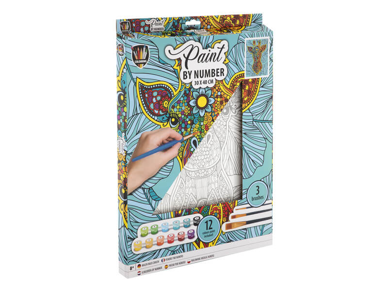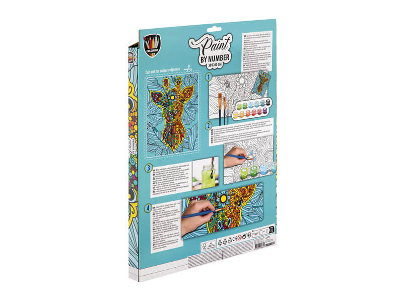 Engedd szabadjára belső művészedet a Fess számok szerint-zsiráf kép segítségével. Ezzel 30×40 cm-es festményt készíthetsz, színes absztrakt zsiráf képével. A csomag mindent tartalmaz, ami az azonnali kezdéshez kell: festménynyomat, mintalap, 12 színű festék és 3 különböző méretű ecset.