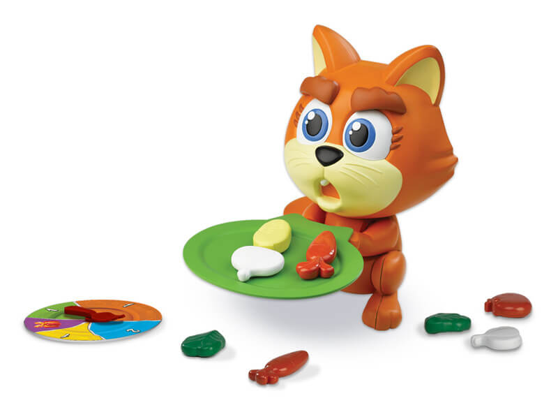 Finnyás Cicus társasjáték Játékosok száma: 2-4 játékos, Korosztály: 4 éves kortól ajánlott, Játékidő: 5-10 perc. Köztudott, hogy a cicák válogatósak, akkor meg aztán főleg, ha zöldségekkel szeretnénk megetetni őket – ahogyan a Finnyás Cicust. A vörös kandúr nem csoda, hogy morcos, hiszen a tálcájára csakis egészséges ételek kerülnek: répa, saláta, krumpli, alma… Egy ideig tűri, de hamar elérkezik egy pont, amikor azt mondja: ebből elég! Ekkor macskához illően mindent leráz a tálcájáról. Ezt a fergeteges játékot garantáltan élvezi majd az egész család, legyen szó óvodásokról vagy épp a nagyiról. A szabály pofonegyszerű: annyi zöldséget kell ráhelyezni a tálcára, amennyit a pörgettyű mutat. Ha szerencsénk van, a másik játékosnak is csúsztathatunk egy-egy egészséges harapnivalót, így megmenekülünk az adott körben. A játékot az nyeri, aki elől a leghamarabb fogynak el a zöldségek. Finnyás Cicus garantálja a vidámságot, az izgalmat és a sok-sok nevetést. Az egyszerű szabályoknak köszönhetően a gyerekek akár önállóan is játszhatják a tesókkal, barátokkal. Tartalma: 1 válogatós cica, 1 tányér, 1 pörgettyű, 20 zöldség (4 paradicsom, 4 sárgarépa, 3 brokkoli, 3 saláta, 3 kukorica, 3 fokhagyma), használati útmutató.