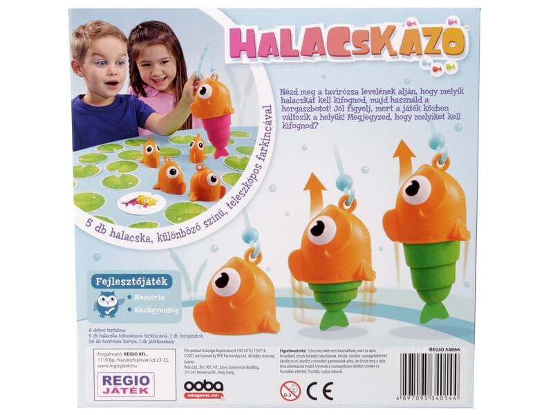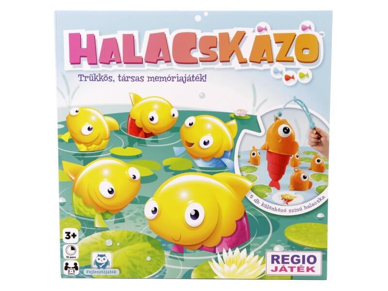 Kövesd és jegyezd meg, melyik halat kell kifognod! A Halacskázó társasjáték egy memóriajáték, ahol halakat kell kifognod a tóból. A halaknak csak a feje látszik ki a tóból, és amikor a horgászbottal kiemeled őket, megtudod, hogy milyen színű a testük. Mindegyik színből kettőt találsz, a teleszkópos farkincák színének a pár-ját kell megtalálnod. A halak játék közben mozognak, kövesd, hogy melyik hal merre jár, és jegyezd meg, melyiket kell kifognod!