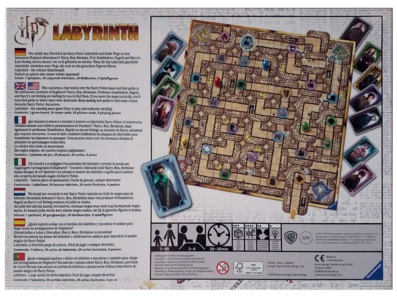 Juss ki Roxfort falai közül, miközben minél több varázslótanoncot szabadítasz ki! A Harry Potter Labirintus társasjátékban a játékosok varázslótanoncok bőrébe bújnak, és próbálnak kiutat találni a Roxfort varázslóképzőből. Az útvonalat a játékosok határozzák meg, és némi taktikára is szükség lesz, hogy az ellenfeleink dolgát megnehezítsük. A játékban minél több Harry Potter szereplőt is meg kell találni, aki a legtöbb lapkát gyűjti, az megnyeri a játékot. A Harry Potter Labirintus társasjáték tartalma: játéktábla, 34 folyosó lapka, 24 képkártya, 4 figura, játékszabály.