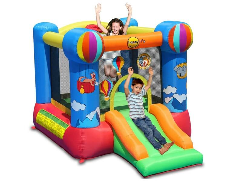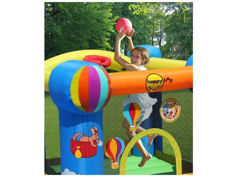 Nagyobb méretű ugrálóvár, hőlégballonokkal díszítve! A Hőlégballon ugrálóvár egy kék alapszínű, csúszdával és védőhálóval felszerelt ugrálóvár, amiben akár egyszerre hárman is játszhattok. Az ugrálóvár erős PVC-ből készült, a védőháló megóvja a gyerekeket a kieséstől. Az ugrálóvárat kompresszorral lehet felfújni, és az ugrálás közben távozó levegőt folyamatosan utántöltni. A Hőlégballon ugrálóvárat egyszerre akár három gyerek is használhatja, a készlet a kompresszort is tartalmazza. Felfújt méretek: 280 x 210 x 185 cm. Terhelhetősége 90 kg.