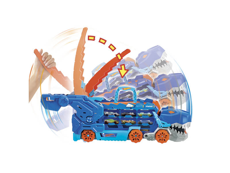 Ez a szörnyeteg több, mint 20 darab 1:64 méretű kisautó szállítására alkalmas, ám ha egy is elékerül, azonnal befalja. Ám elég egy egyszerű mozdulat, hogy két lábra álljon és egy kétsávos versenypályává változzon.
