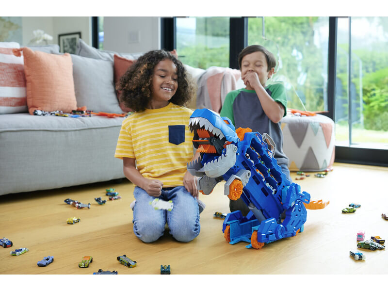 A Hot Wheels világában bármi előfordulhat, egy veszedelmes, autófaló T-Rex-ből is lehet versenypálya, szállító járgány vagy akár mindez egyben!