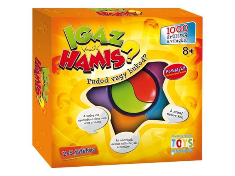 Az Igaz vagy hamis? társasjáték, az 1000 elképesztő állítás és tény játéka. Az interaktív társasjáték az egész családnak szórakoztató élményt nyújt. A több mint 1000 kérdésének köszönhetően (köztük Magyarországra és a magyar kultúrára vonatkozólag is) mindig izgalmas játékban lehet része-tek! A különleges kvíz-show társasjátékban állításokat fogsz hallani a vicces műsorvezetőtől és Neked azok hallatán el kell döntened, hogy az állítás igaz vagy pedig hamis. Ha a válaszod helyes, akkor ponttal fog jutalmazni a játékmester, ha viszont rosszul tippeltél, akkor pontot fog levonni tőled. A játék körről körre bonyolódik, így mindig izgalmas és szórakoztató tud maradni. Az Igaz vagy Hamis? társasjáték 1000 elképesztő állítással és maximum 5 játékos játszhatja.