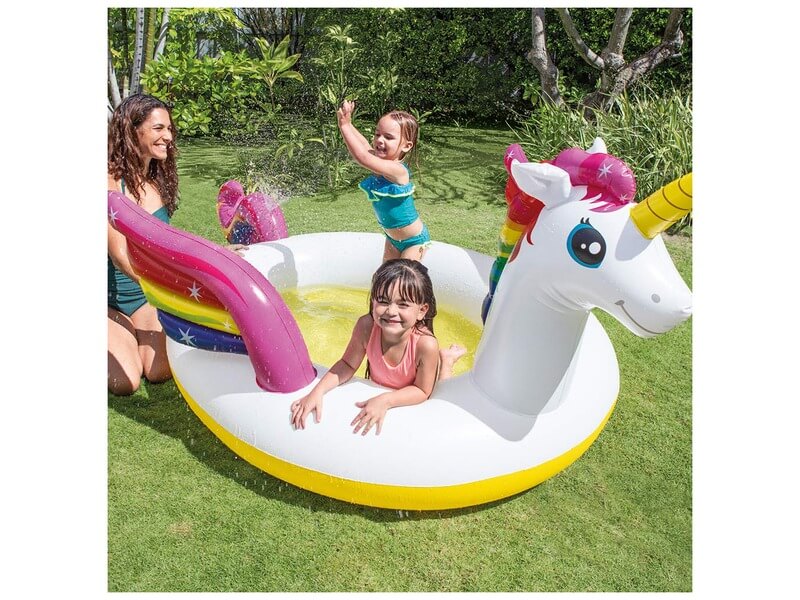 Hűsölj az egyszarvú medencében a legforróbb nyári napokon! Az Unikornis spriccelős medence egy erős PVC felhasználásával készült egyszarvú, ami a legnagyobb kánikulában is lehűti a kedélyeket. A medencét biztonsági szelepen keresztül lehet felfújni, az egyszarvú ló szivárvány színű sörénnyel és szárnyakkal van díszítve, rá lehet kötni a kerti tömlőt is, így az unikornis spriccelő vízzel hűti a lubickoló gyerekeket. Az Unikornis spriccelős medence készlet egy öntapadós javító foltot is tartalmaz. Felfújt méretek: 272 x 193 x 104 cm.