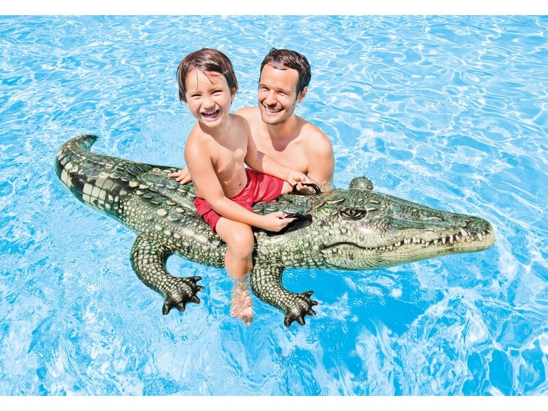 Pancsolj a krokodil hátán ülve! Az Aligátor hullámlovagló egy kapaszkodókkal felszerelt felfújható krokodil figura, amire a gyerek fel tud ülni. A krokodil hátán kényelmesen lehet pancsolni, játszani, az aligátor biztonsági szeleppel, két kamrán keresztül fújható fel. Az Aligátor hullámlovagló készlet egy javító foltot is tartalmaz. Felfújt méretek: 170 x 86 cm.
