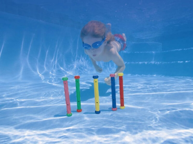 Merülj le a medence aljára, hozd fel a botokat! A Búvár bot 5 darabos készlet színes, a víznél nehezebb rudakat tartalmaz, amik lesüllyednek a medence mélyére. A játék lényege, hogy a gyerekeknek meg kell találniuk a víz mélyén heverő búvár botokat, majd le kell úszni értük, és fel kell hozni a medence partjára. A Búvár bot 5 darabos készlet segít elsajátítani az úszás közbeni helyes légzést, illetve a víz alatti úszást is. Csomagolás méretei: 17 x 3 x 30 cm.