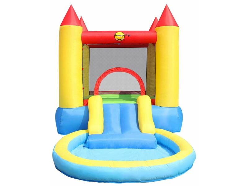 Csússzatok le a csúszdán a hűsítő medencébe! A Kastély ugrálóvár medencével egy nagyobb, tornyokkal, védőhálóval és csúszdával felszerelt ugrálóvár, amin akár egyszerre négyen is ugrálhattok. A csúszda egy sekély medencében végződik, amit kerti tömlővel lehet feltölteni, a víz segít a legforróbb napokon is lehűlni a gyerekeknek. Az ugrálóvár erős műanyagból készült, a kompresszorral pillanatok alatt fel lehet fújni. A Kastély ugrálóvár medencével készlet tartalmazza a kompresszort is. Felfújt méretek: 365 x 200 x 190 cm. Maximális súly (kg-ban): 68.
