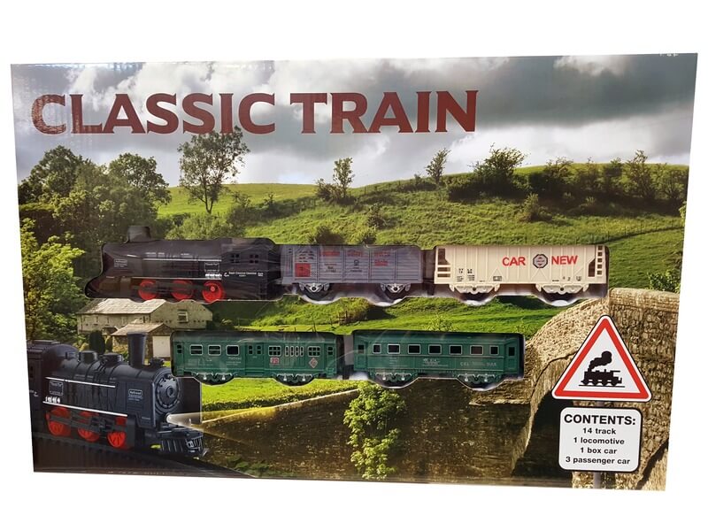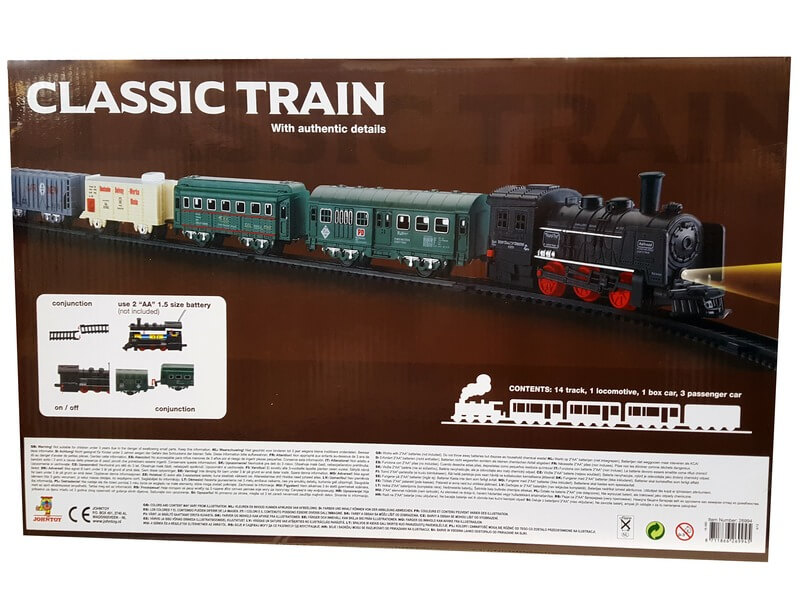 Szállíts utasokat és rakományt a gőzmozdonnyal! A Klasszikus vonat 19 darabos készlet síneket, egy gőzmozdonyt, két tehervagont, és két személyszállító vagont találsz, amikből egy komplett szerelvényt lehet összerakni. A vonatkocsikat könnyen egymáshoz lehet kapcsolni, a sínek egy mozdulattal összeilleszthetők, utána már csak be kell kapcsolnod a mozdonyt, és a sínre tenned, hogy elinduljon a szerelvény. A Klasszikus vonat 19 darabos készlet összesen 14 darab vasúti sínt foglal magában. A játék 2 darab AA ceruzaelemmel működik, a csomagolás az elemeket nem tartalmazza. Csomagolás méretei: 47 x 4 x 29 cm.