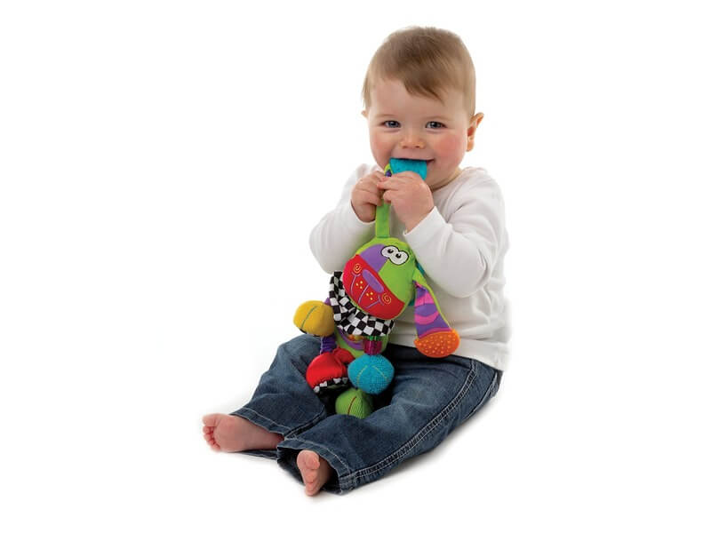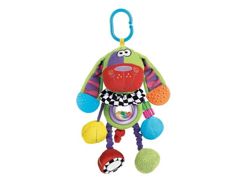 Felakasztható kiskutya, csörgő-zörgő hangokkal! A Kutyás rágóka bébijáték plüssből készült zöld kutyus, rengeteg meglepetéssel, amik lekötik a pici figyelmét. A kutyus egyik lába sípoló hangot ad ki magából, míg egy másik egy tükörben ismerkedhet meg a gyerek saját képével. A kutyus fülei rágókaként használhatók, a különböző tapintású textilek fejlesztik a tapintást és az érzékszerveket. A Kutyás rágóka bébijáték babakocsira, kiságyra is felakasztható.