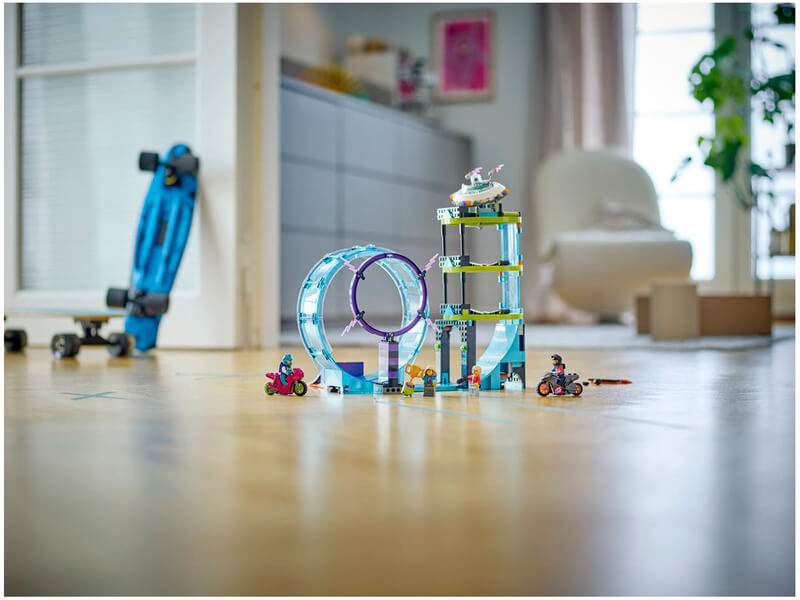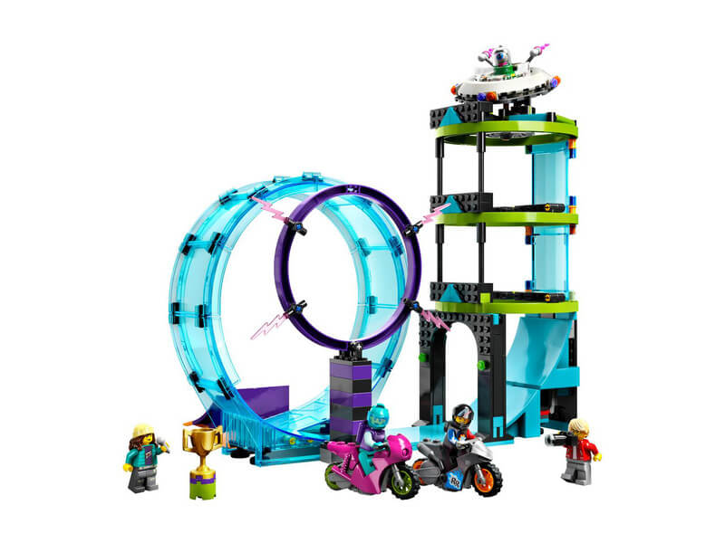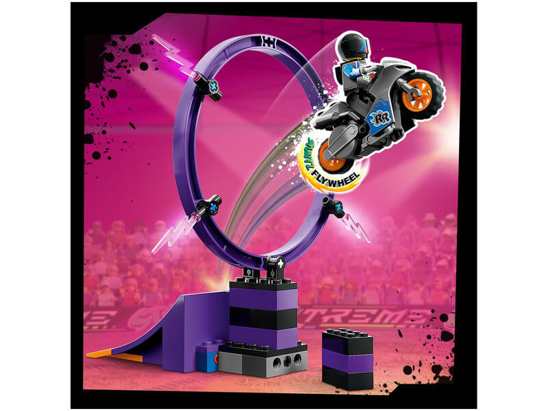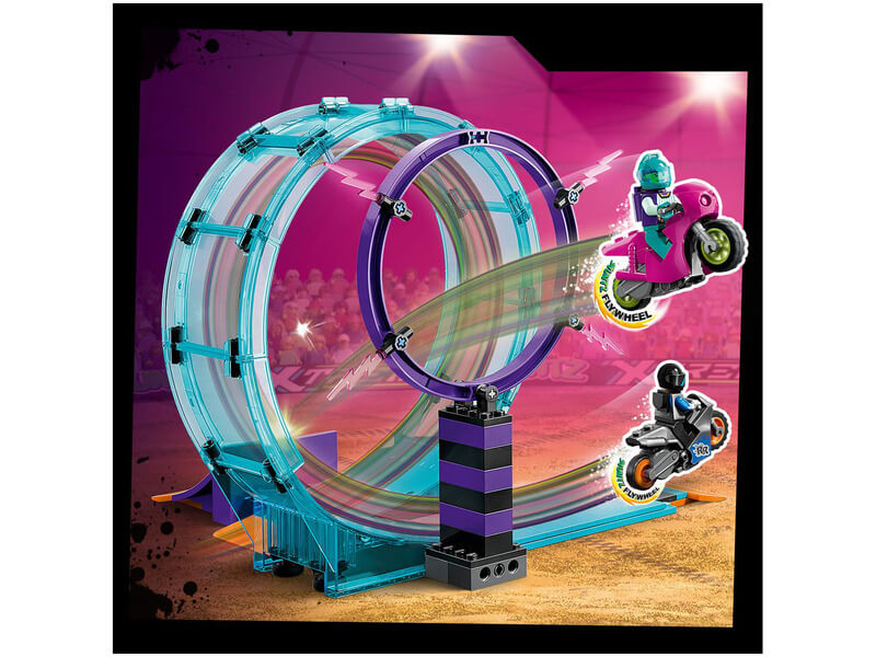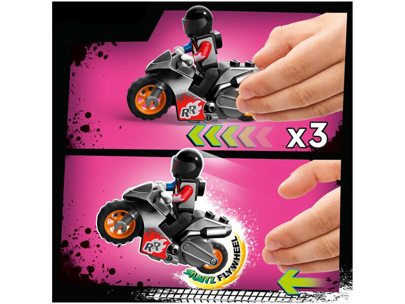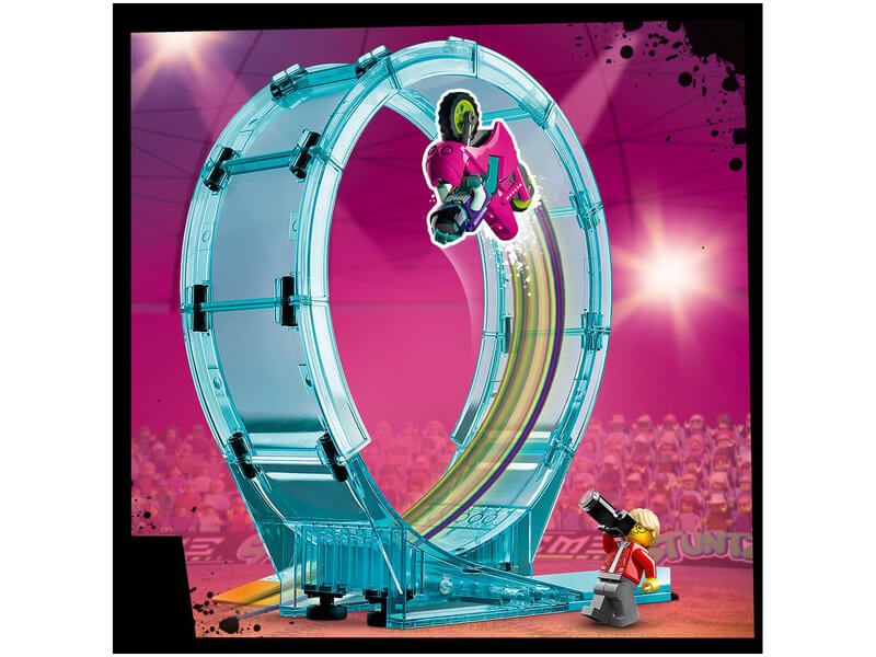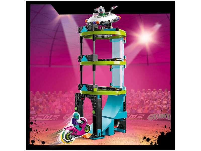 A játékkészlet kaszkadőr kihívásai között egy 360°-os hurkot, egy tűzgyűrűt és egy „földönkívüli torony” függőleges oszlopát, valamint egy ugratórámpát, 2 kaszkadőr motort és 2 motoros minifigurát is találsz. A gyerekek beindíthatják a kaszkadőr motort, hogy átbukfencezzenek a hurkon, átugrassanak a tűzgyűrűn, és elérjék a földönkívüli torony tetejét.