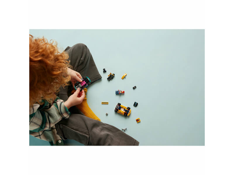 A gyerekek testközelből élvezhetik a hatalmas versenyeket, és megrendezheti saját versenyeiket ezzel a szórakoztató játékszettel, amely 2 gokart versenyautót és 2 pilóta minifigurát tartalmaz.