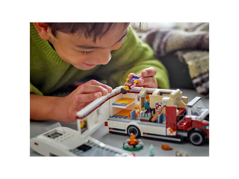 A gyerekek bárhová elutazhatnak, ahová csak a képzeletük viszi őket a LEGO® City Lakóautó a kalandos nyaraláshoz játékkal (60454). Ez a szórakoztató, 6 éves kortól ajánlott, lakóautós szett olyan valósághű részleteket rejt, mint a modern élettér, ahol konyha, mosdó, emeletes ágy és bölcső található. A készlet tartalmaz egy asztalt és 2 széket, amelyeket kint és bent is használhatsz. Sőt, a szett része még egy játék gitár és egy tábortűz is! Csak játssz az anyuka-, az apuka -és a kisbabafigurákkal, és indulhat az izgalmas történetekkel kísért, fantáziadús játék! Ehhez a LEGO City kempingjátékhoz tartozik egy nyomtatott, lépésről lépésre vezető építési útmutató, de a gyerekeknek szórakoztató és intuitív építési élményben lehet részük, ha ellátogatnak a LEGO Builder appra, ahol felnagyíthatják és 3D-ben elforgathatják a modelleket, építés közben követhetik a haladásukat, továbbá új szetteket fedezhetnek fel és menthetnek el. A LEGO City Nagyszerű járművek játékkészletek funkciókban gazdag, szárazföldi, levegős és vízi játékokat kínálnak a fantáziadús játékhoz, korlátok nélkül. A gyerekek ezt a játék lakóautót tartalmazó LEGO szettet a LEGO City választék többi (külön megvásárolható) termékéhez is hozzáadhatják a még izgalmasabb kalandok érdekében!