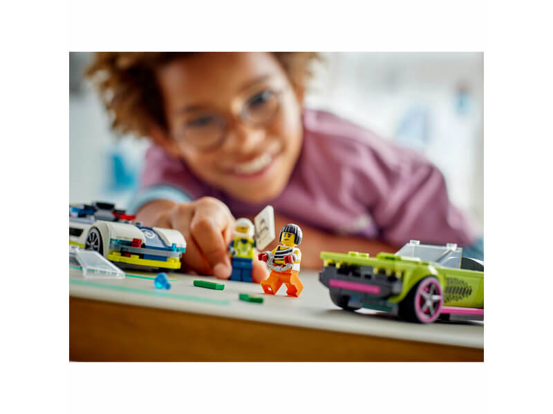 Szórakoztató LEGO® City autós játékkészlet 6 éven felülieknek, rendőri elfogó járművel és egy sportautóval, amelyekhez egy rendőrtiszt és egy szélhámos minifigura is tartozik a hősies üldözéshez.