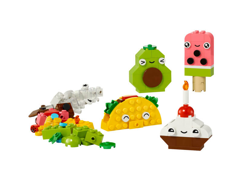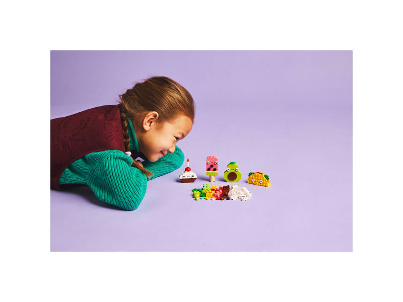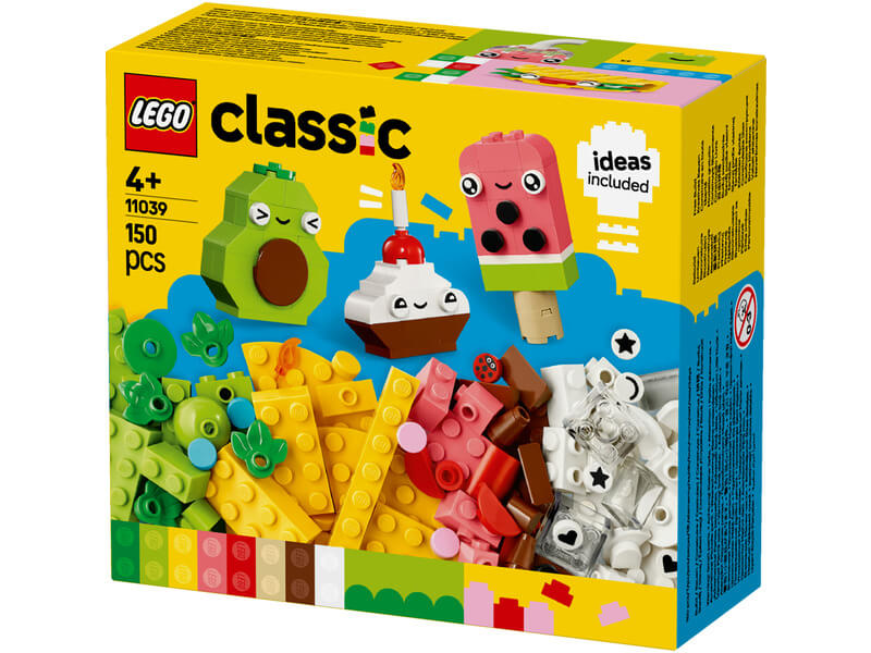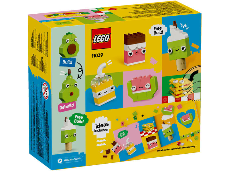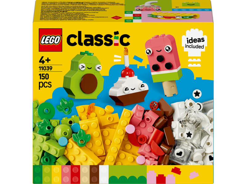 A LEGO® Classic Kreatív finomságok (11039) egy építőkészlet, amely 4 éves vagy annál nagyobb gyermekeknek készült. A rengeteg ételfigurával ez a fantáziadús játék ideális arra, hogy a gyerekek különféle szerepekbe bújjanak. A végtelen sok építési, átépítési lehetőséggel és a szabad építés örömével ez a kezdő építőknek szóló LEGO szett fejleszti a gyerekek magabiztosságát, koncentrációs és problémamegoldó készségét. A gyerekek a szép színes építőelemekből és különleges elemekből (mint például a szemek, a szájak és a különféle dekorelemek) 4 aranyos játék finomságot építhetnek meg: egy muffint, egy fagyit, egy avokádót és egy tacót. A kreatív szórakozás nem ér véget, hiszen a gyerekek összekeverhetik a kockákat, és cukorral díszített tortává, buborékteává, körtévé és paninivá építhetik át a modelleket. Ha a gyerekek egyre magabiztosabbá válnak az építésben, akkor az intuitív építési útmutató segítségével megváltoztathatják az arckifejezéseket, a formákat, a színeket, és olyan új finomságokat alkothatnak, mint a zöld fagylalt, az üdítőkarton, a dinnyeszelet, a csokiszelet és a hatalmas méretű szendvics.