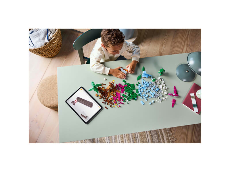 A készletben megtalálható T-Rex, pterosaurus, triceratops, brontosaurus és egy tojásba bújt bébi T-Rex. A játékhoz tartozik egy vulkán, egy pálmafa és számos kiegészítő, mint például szem- és szájelemek, amelyek arckifejezéseket adnak a dinóknak. A gyerekek szabadon variálhatják a kockákat, és az intuitív építési útmutató segítségével saját fantáziadús dinókat tervezhetnek.