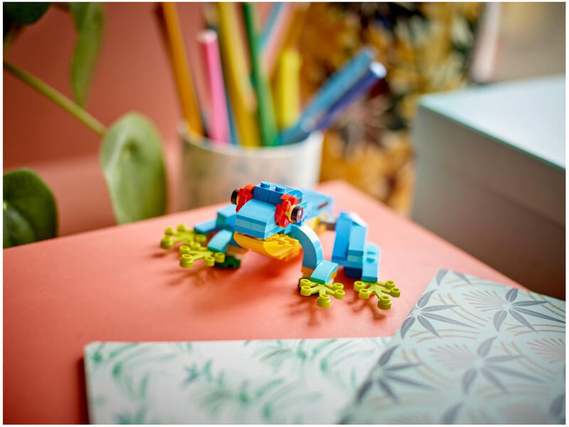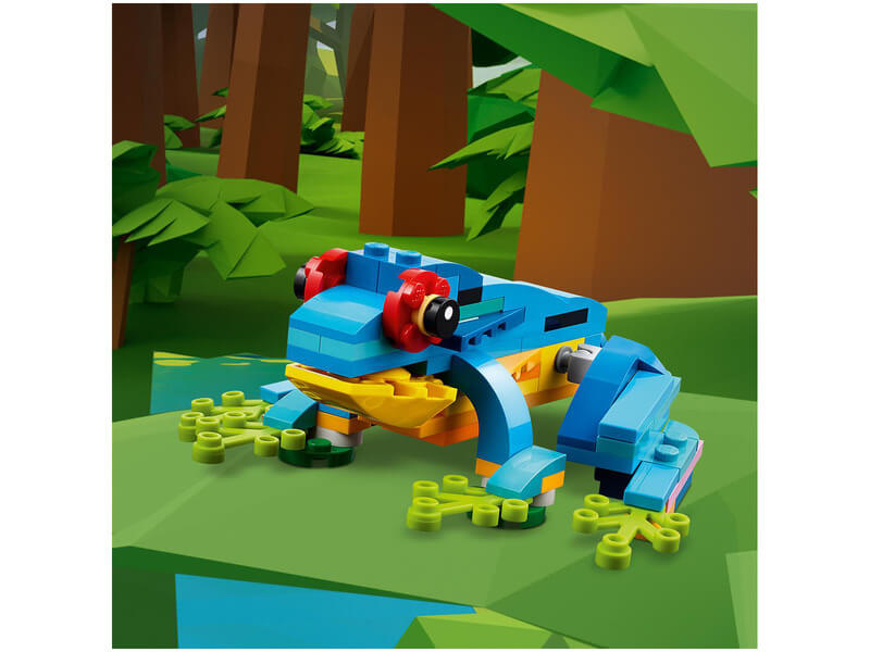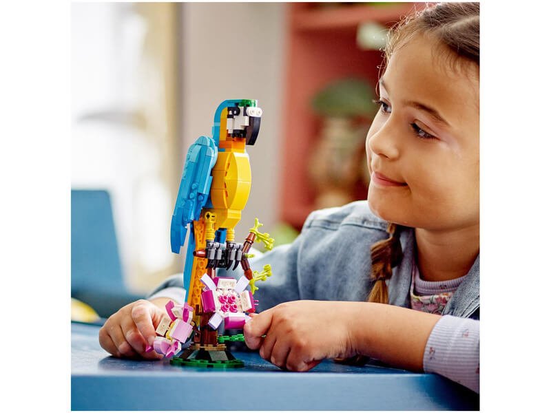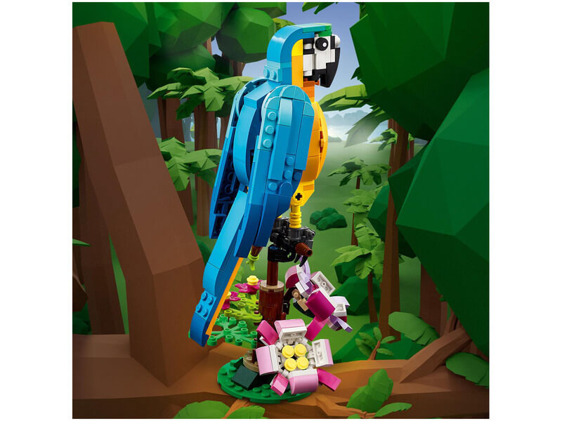 Kalandozz az esőerdőben, és vágj bele mókás kalandokba 3 egzotikus állattal! Építhetsz egy gyönyörű papagájt, ami egy faágon ül, körülötte színpompás virágokkal.