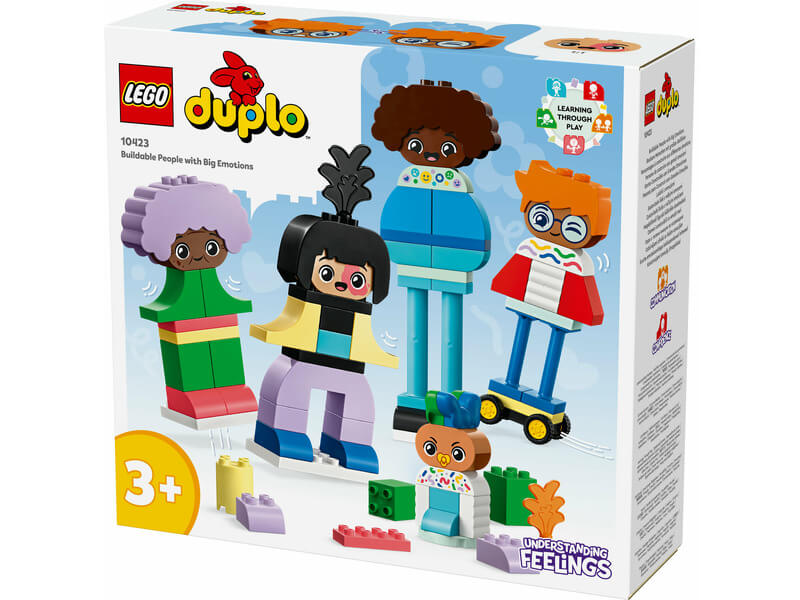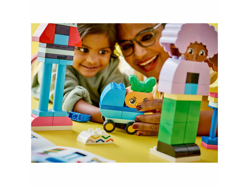 Töltsd fel a 3+ éves kisgyermekek játékidejét sok örömmel és kreativitással a LEGO® DUPLO® Városi kalandok Megépíthető figurák különféle érzelmekkel (10423) szett segítségével! A kíváncsi gyerekek felfedezhetik, hogy milyen sokfélék az emberek, ésez a barátságos játék segít megértetni velük, hogy ha különbözik is a külsőnk, mi mind lehetünk barátok. A testre szabható játék 71 kockát és elemet tartalmaz, amelyekből 5 figurát lehet megépíteni. Az elemek közt 5 parókakocka és 1 kerekes alap találh ató. A kicsik fantáziája szárnyakra kap, miközben cserélgetik és összepárosítják a játékok testét, lábát, arcát, haját, és barátságos figurák végtelen sorát alkotják meg. A 10 különböző arckifejezést ábrázoló kockával a gyerekek megmutathatják, hogy mit éreznek a figurák, és el is mondhatják, hogy mit jelentenek ezek az érzések. A szett kiváló témaindító is lehet a felnőttek számára, hogy beszélgessenek a kicsikkel arról, milyen csodálatos, hogy ennyire különbözőek vagyunk! Ez az építőjáték érdekes formájú, színes kockákat tartalmaz, ami felfedezésre ösztönzi az apró ujjakat és határtalan kreativitást ad a kicsik kezébe.