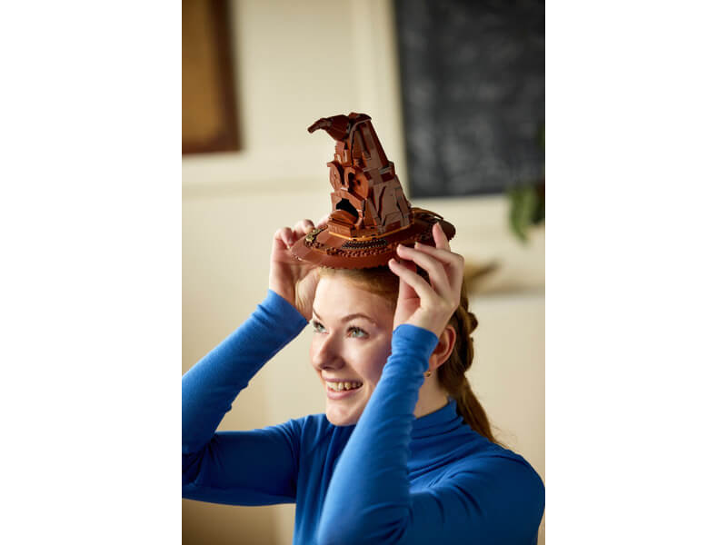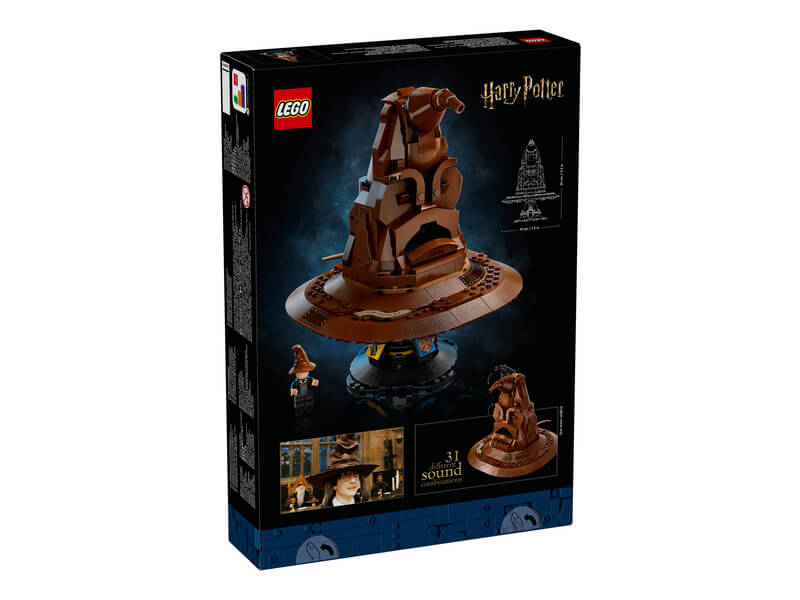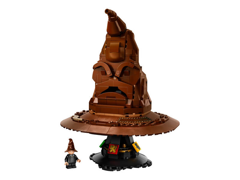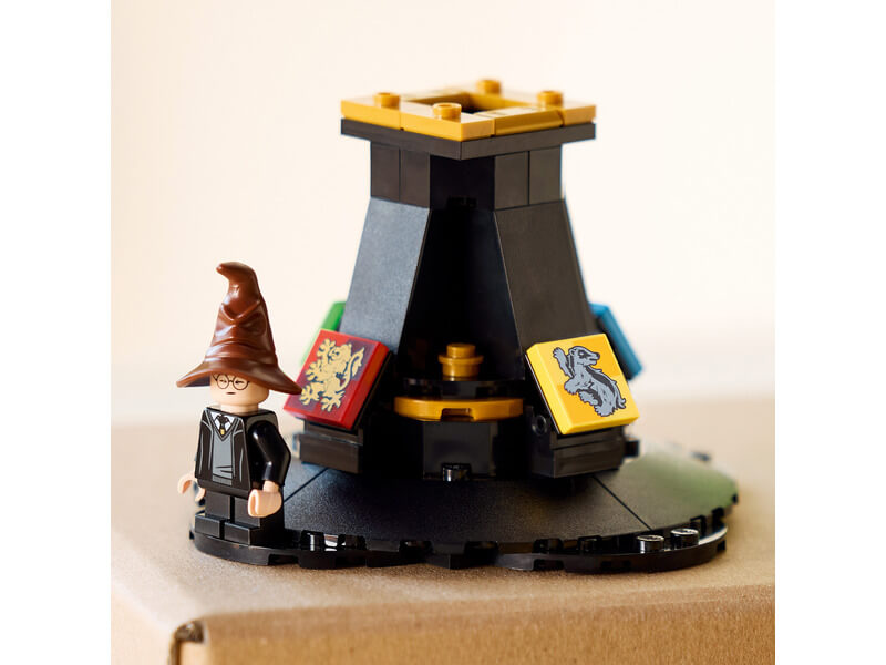 A kalapot az állványra helyezheti, amelyet Griffendél™, Mardekár™, Hufflepuff™ és Hollókarom™ címere díszít. Ez az egyedi LEGO készlet tartalmaz egy Harry Potter minifigurát is, aki a beszélő kalapot viseli, hogy teljessé tegye ezt a különleges kiállítási elemet.