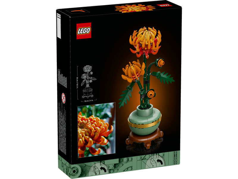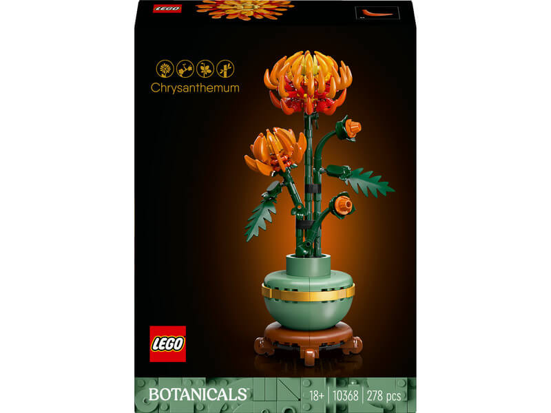 Ez a részletgazdag replika, amelynek beállítható levelei és szirmai vannak, az élénk narancssárga virágot bimbózó, virágzó és kivirágzott állapotában örökíti meg. Tartozik hozzá egy pasztellzöld virágcserép arany színű szalaggal, és egy fahatású állványon áll. Könnyen összerakható, és a krizantém növénymodellje bárhol elegáns dekorációvá válik, sőt, a LEGO Botanikai gyűjtemény többi (külön kapható) készletével együtt is kiállíthatod.