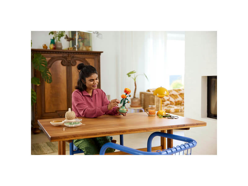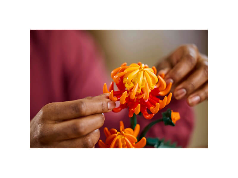 - Virágzó bimbók – A beállítható levelekkel és szirmokkal ellátott LEGO® Icons Krizantém az élénk narancssárga virág különböző fejlődési szakaszait jeleníti meg: 1 kivirágzott, 1 virágzó és 2 bimbózó virág